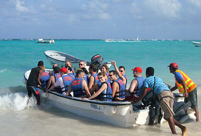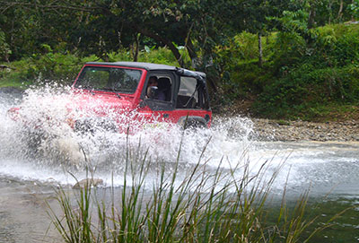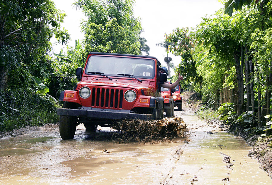No river and no mountain can stop us on the off-road jeep safari. It goes straight through the jungle, along the Atlantic beach, and is a real adventure. The cigar and rum factory, a cave tour and “Altos de Chavon” are interesting, but the speed boat race is the best fun. From a helicopter, you can see the island paradise from above, or you can go deep-sea fishing, play golf or relax with a massage in the beach cabanas. Brightly painted buses with a thatched roof, cocktails and live music take us to “Jellyfish Beach Club”, where we experience a spectacular farewell dinner with dancing and a fire show at the sea. Life is glorious.