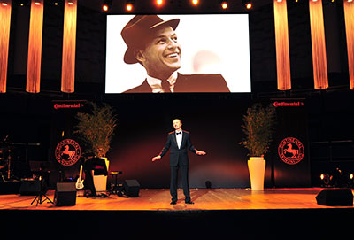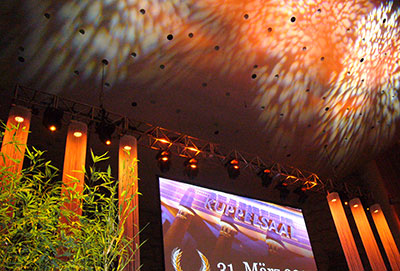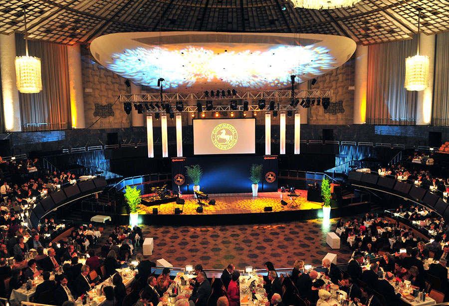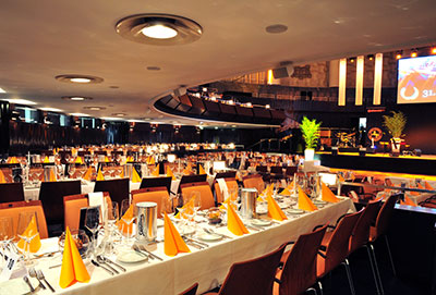 The good old days are reflected in a fast-paced potpourri of a multi-media show changing to musicals that ensures a lively atmosphere for the 500 guests accompanied by their partners. Everybody indulges in reminiscences. Anecdotes and highlights are come to life in the company comedy show, which has been designed for this spectacular anniversary gala. The international show band, alternating with a disc jockey, provides a full dance floor. The guests receive a precious golden badge of honor, an imperishable memory of their special day. Our team of photographers create extraordinary photos of the guests. These print-out photos are also immediately given away as souvenirs. There is a farewell with words of thanks, printed on roses.