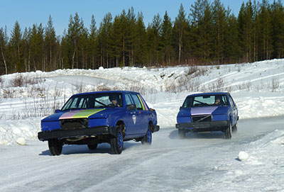 In our Stock Car Ice Races, it is permitted and indeed strongly encouraged to force cars off the track or to crash into other cars. Our older Volvos have a rear-wheel drive and have been specially rebuilt. They are equipped with a roll cage, special studded tires and racing seats, so we can guarantee safety at the highest level.