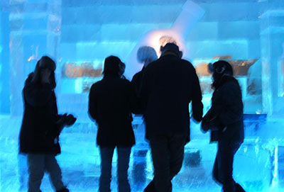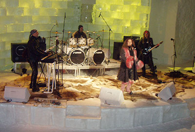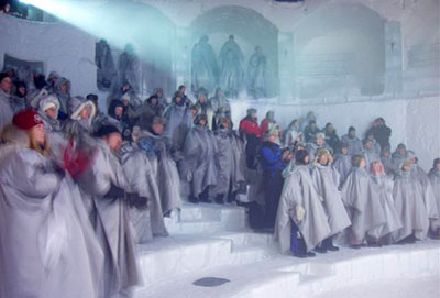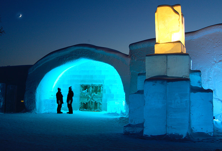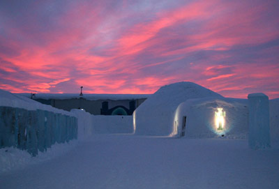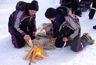 Stack up wood and light a fire in order to make Sami coffee, throw a lasso; all teambuilding actions are quite fun. A leisurely reindeer-drawn sleigh ride ends with a torchlight hike to the tipi. Sitting on reindeer skins at an open fire, we enjoy delicious wild meat specialities in a companiable group, and we sing "Jökk" songs to "Glökk" drinks. After the show on the stage in the Ice Hotel, the evening ends with a late-night drink at the famous Ice Bar, stylishly served in glasses made of ice.